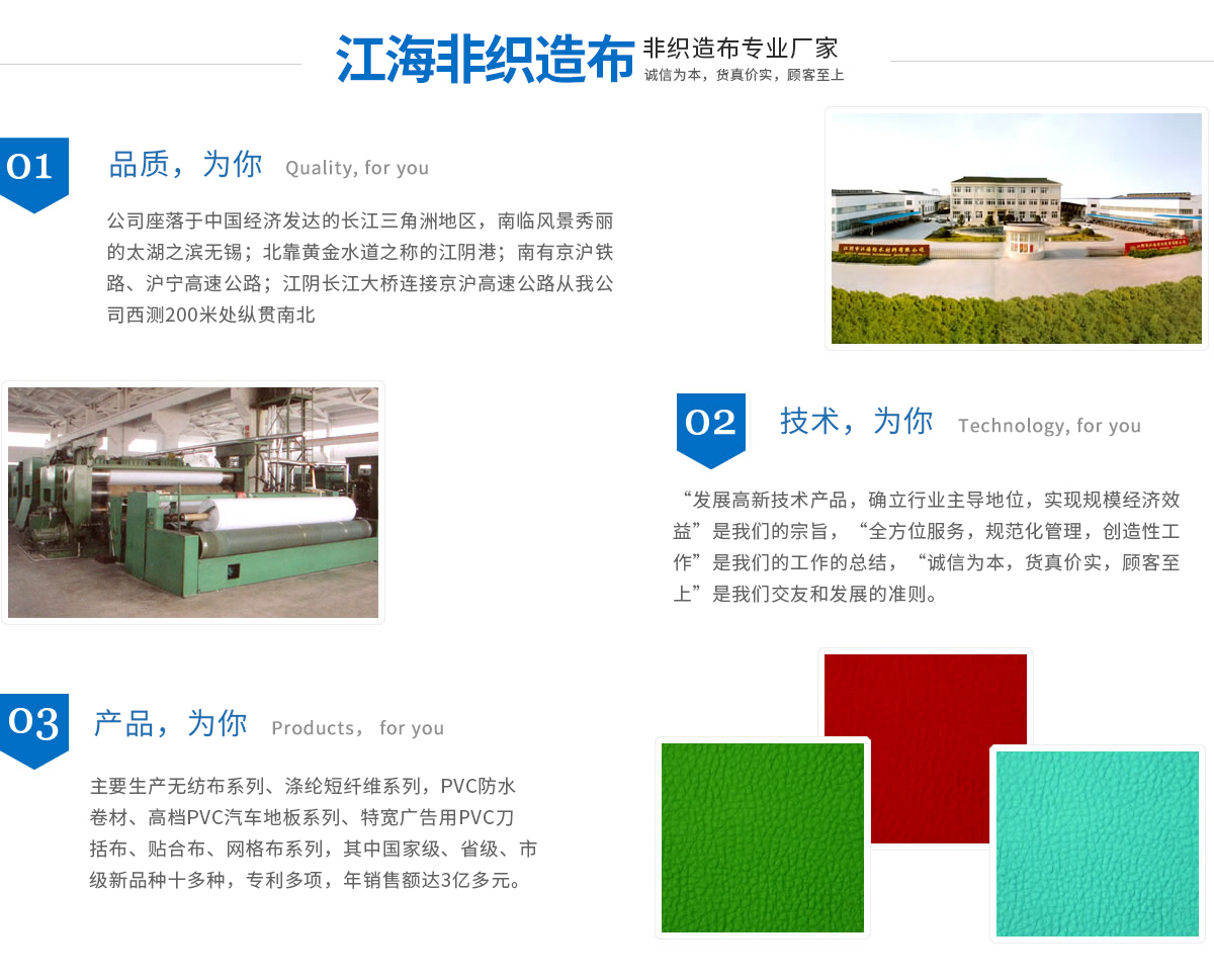 江海企業(yè)有江陰市江海非織造有限公司、江陰市江海防水材料有限公司、江陰市三江寬幅無(wú)紡布有限公司、江陰市三江織物涂層新材料有限公司組成,均屬于江蘇省民營(yíng)科技企業(yè)。企業(yè)現(xiàn)擁有員工近千名,占地15萬(wàn)平方米,廠房建筑面積達(dá)80000多平方米,凈資產(chǎn)超億元,主要生產(chǎn)無(wú)紡布系列、滌綸短纖維系列、PVC防水卷材、高檔PVC汽車(chē)地板系列、特寬廣告用PVC刀括布、貼合布、網(wǎng)格布系列,其中國(guó)家級(jí)、省級(jí)、市級(jí)新產(chǎn)品十多種,專(zhuān)利多項(xiàng),年銷(xiāo)售額達(dá)3億多元。